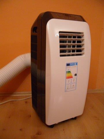 Niewielkich rozmiarów przenośny klimatyzator na 230V (wymiary 34x34x78 cm), moc 2,3kW, masa 23,5kg